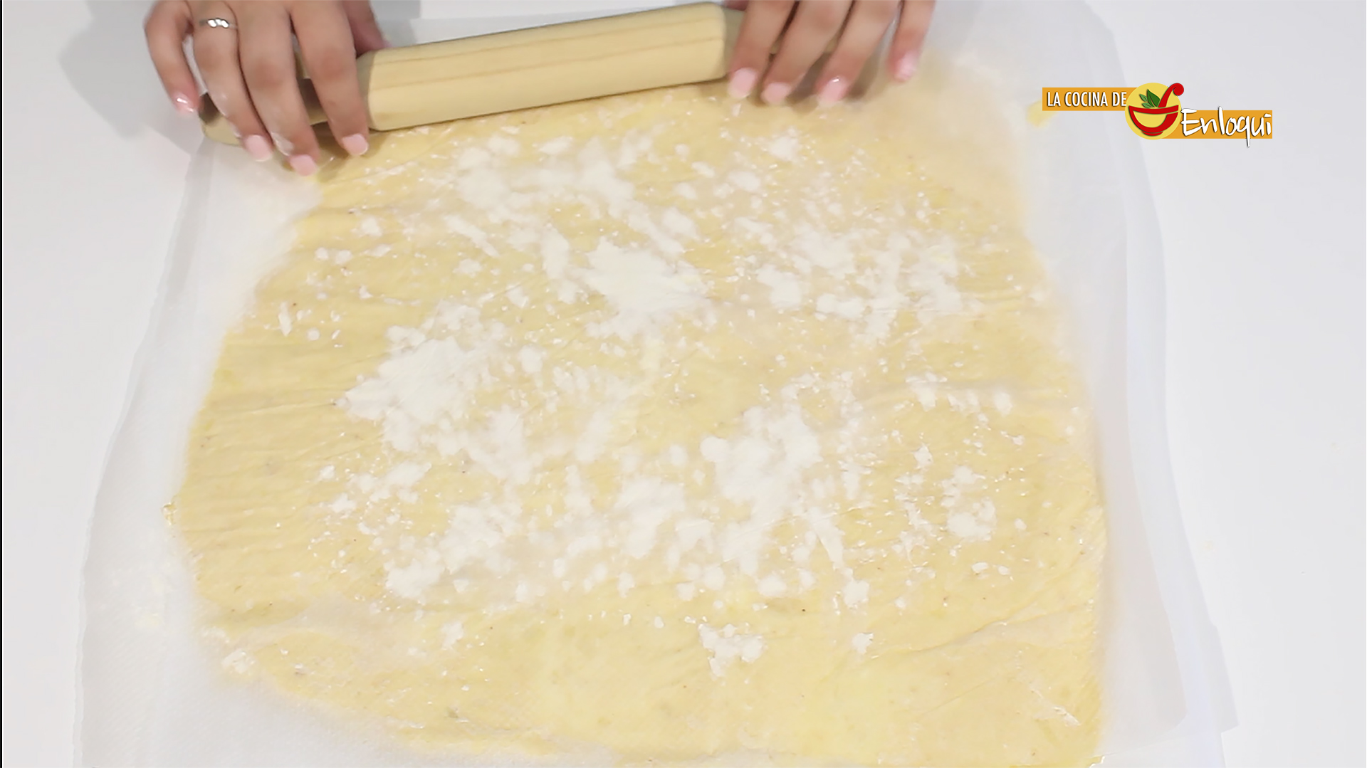 Coloca sobre la superficie de trabajo un papel de horno y espolvorea con harina. Vierte sobre él la mezcla anterior. Coloca otro papel de horno por encima y, con la ayuda de un rodillo, extiende la masa hasta que quede de forma homogénea con un grosor de entre medio y un centímetro.