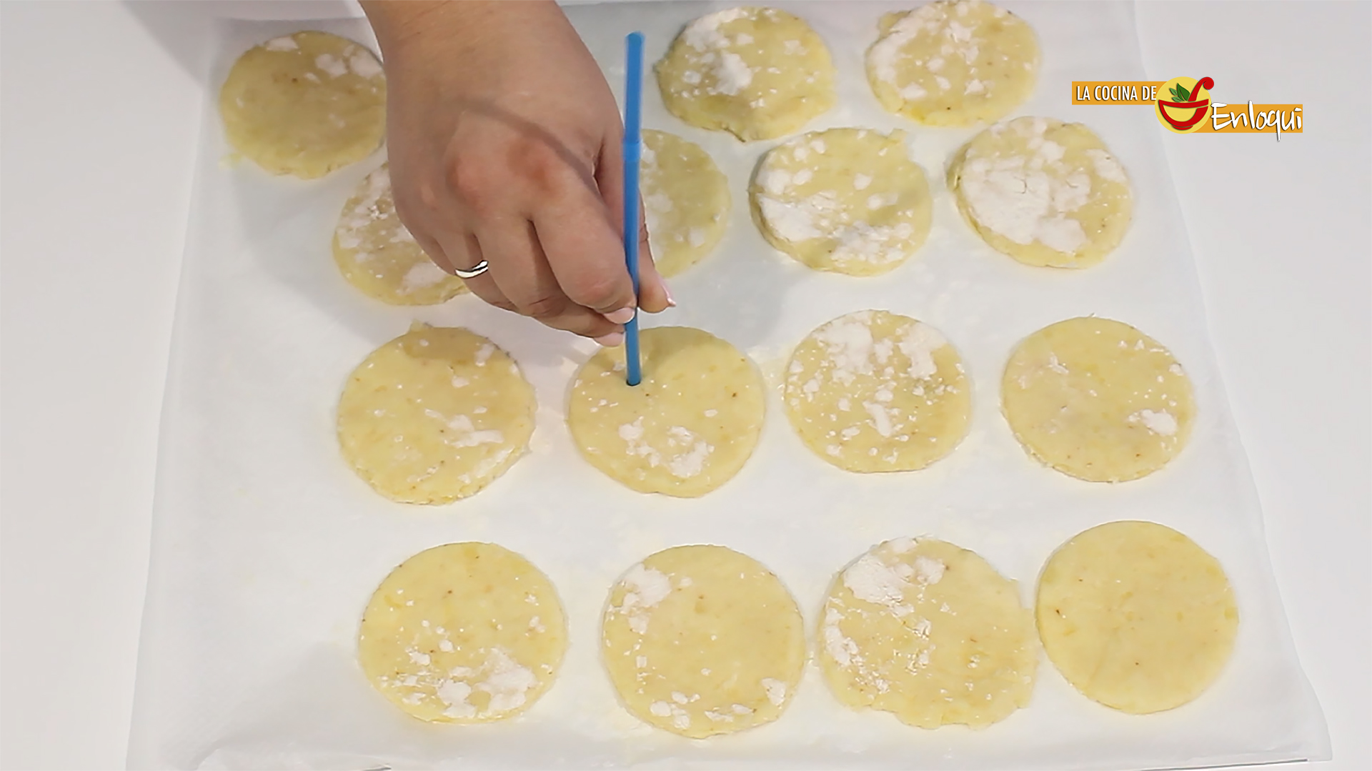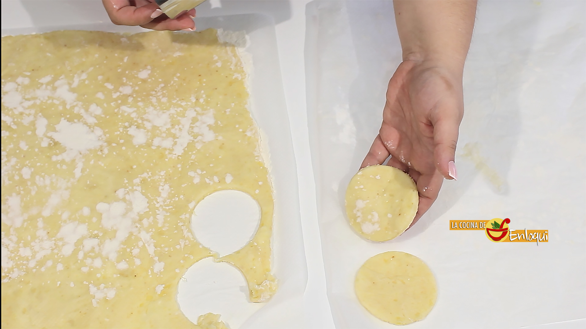 Con la ayuda de un corta pastas, un vaso o cualquier recipiente redondo corta círculos de masa y colócalos sobre el papel que has colocado justo al lado.