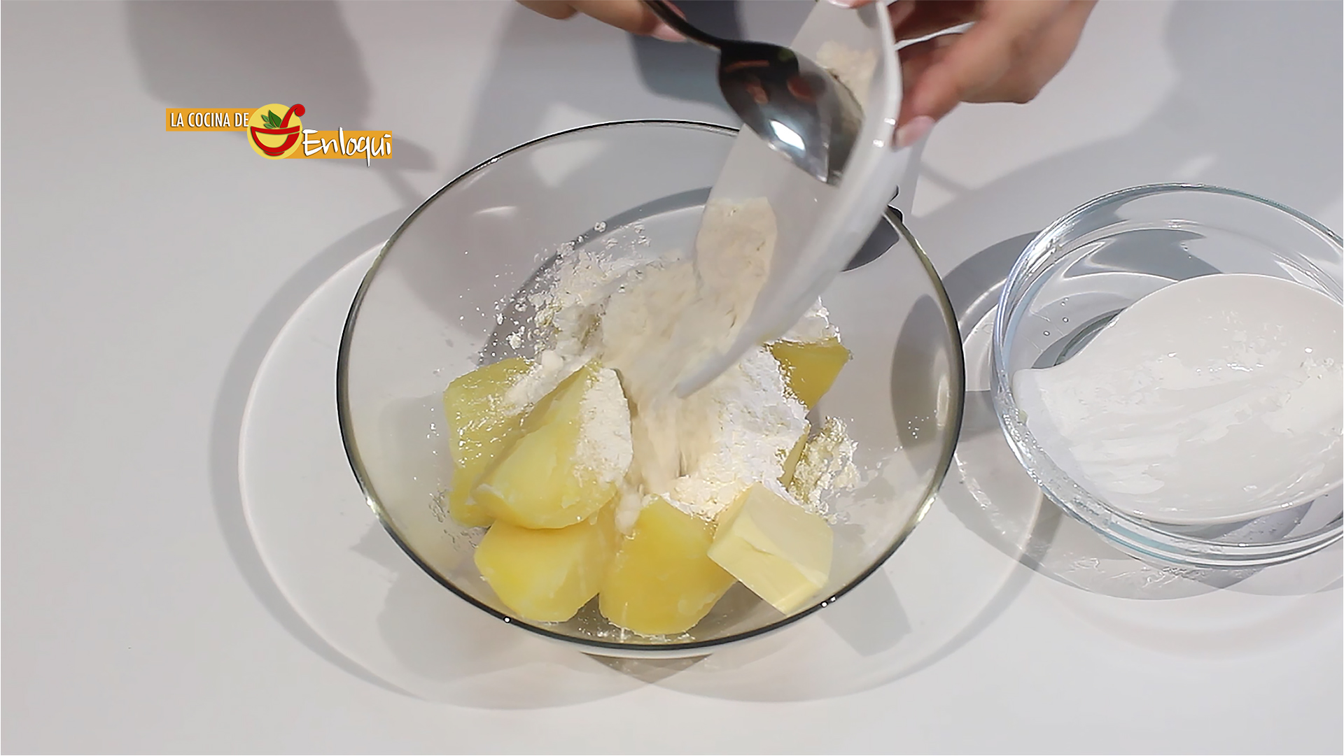 Estando aún calientes las patatas añade la mantequilla, junto con la maicena y la harina de trigo.