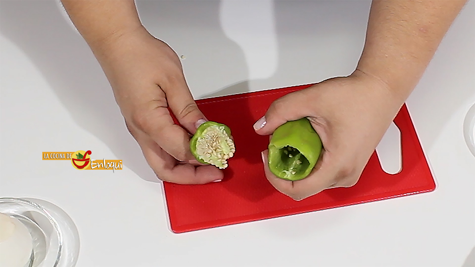 También debes pelar la cebolleta o cebolla tierna, eliminar el rabo y pepitas o semillas del pimiento verde.