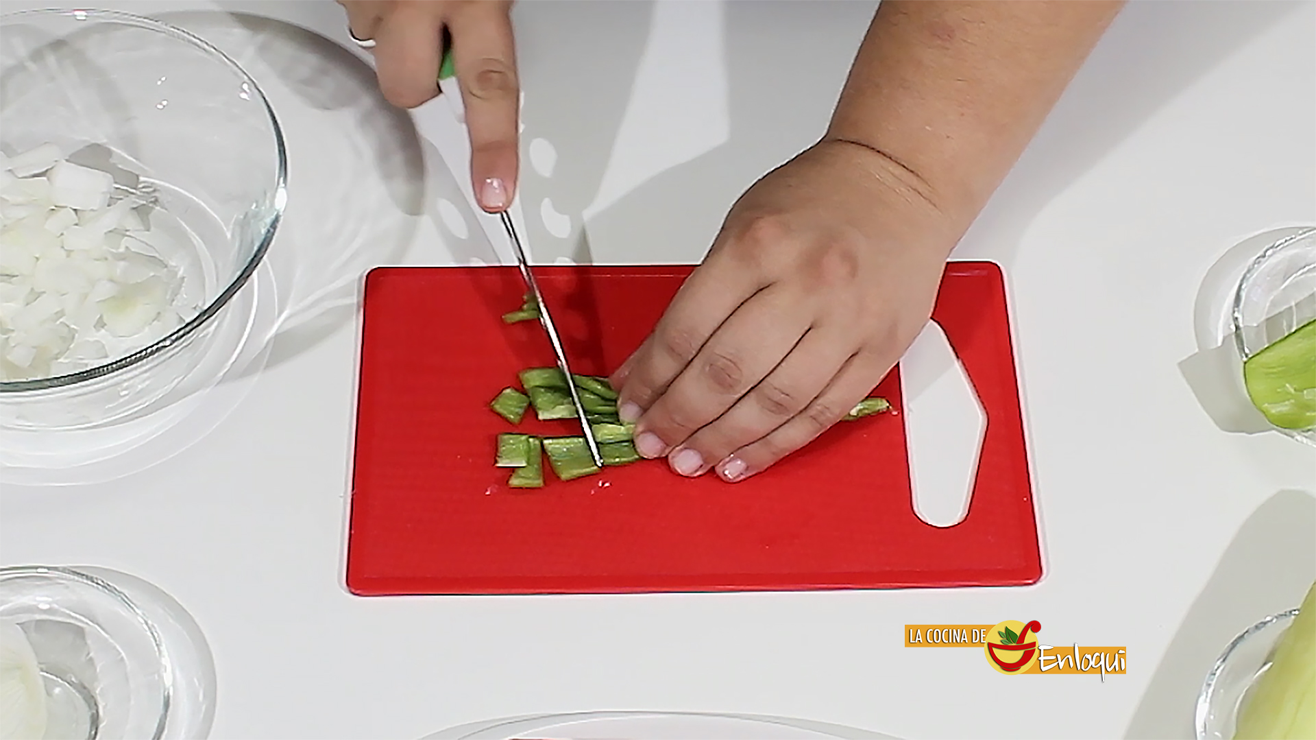 A continuación pica el pimiento de la misma forma y el pepino. Vierte todo en el bol.