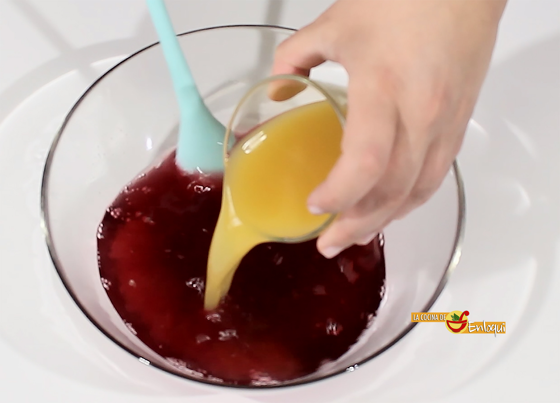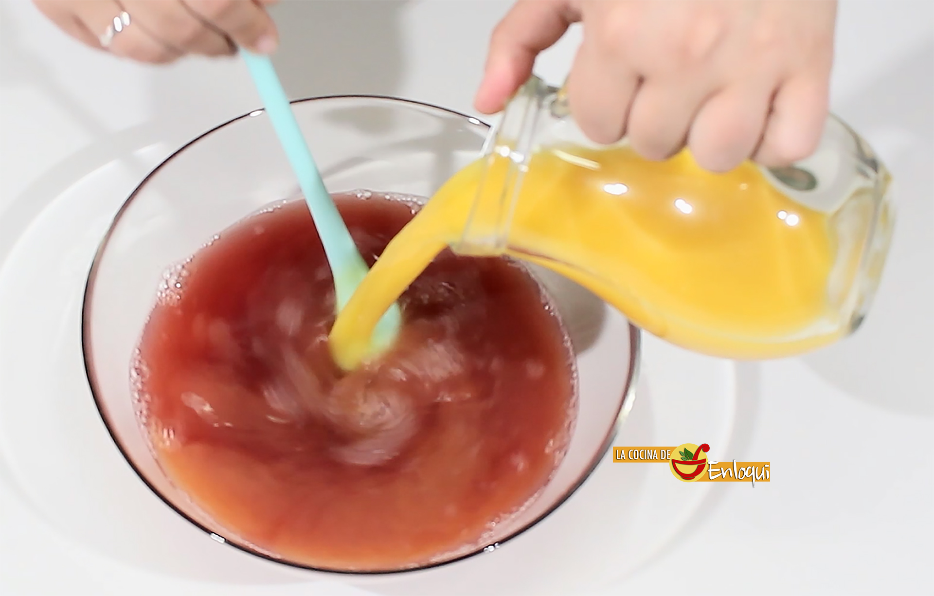 Después añade el zumo de piña y el de naranja. Sigue removiendo para que todos los ingredientes queden completamente integrados.