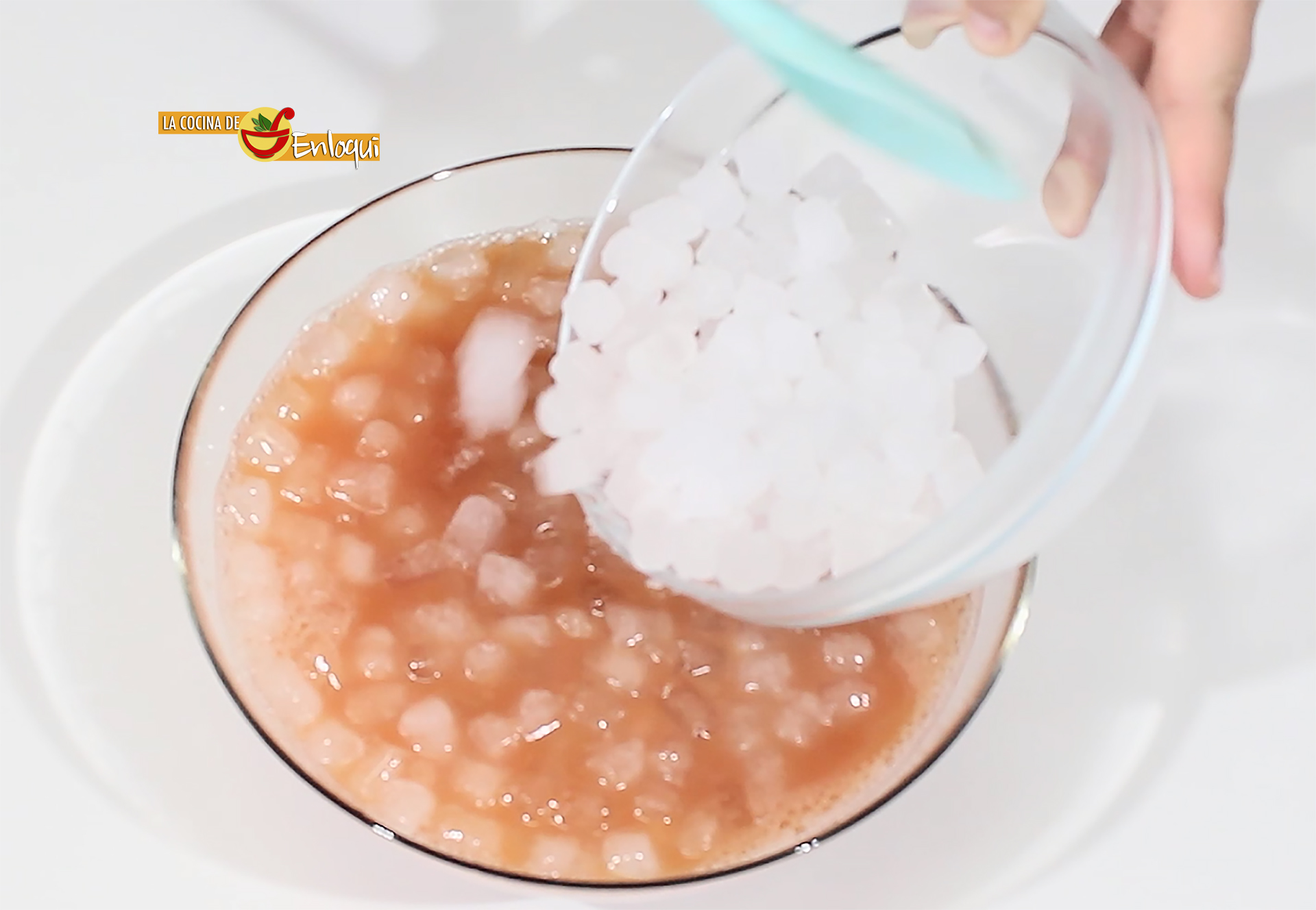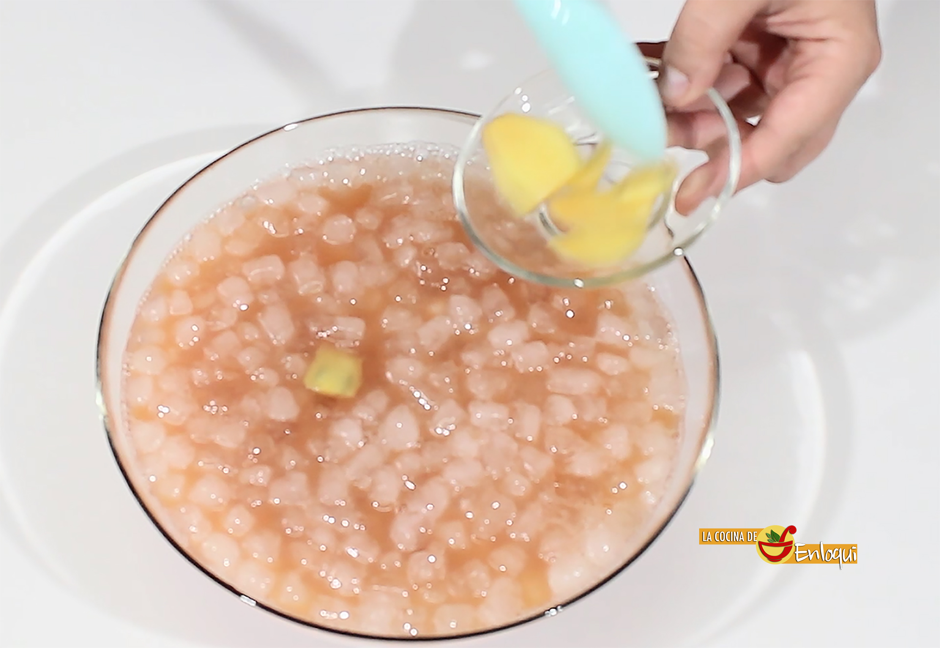 Es el momento de poner hielo picado que aportará todo el frescor a nuestra bebida y pon en el bol también las rodajas de jengibre que habías reservado antes. De esta forma seguirán aportando sabor al combinado.