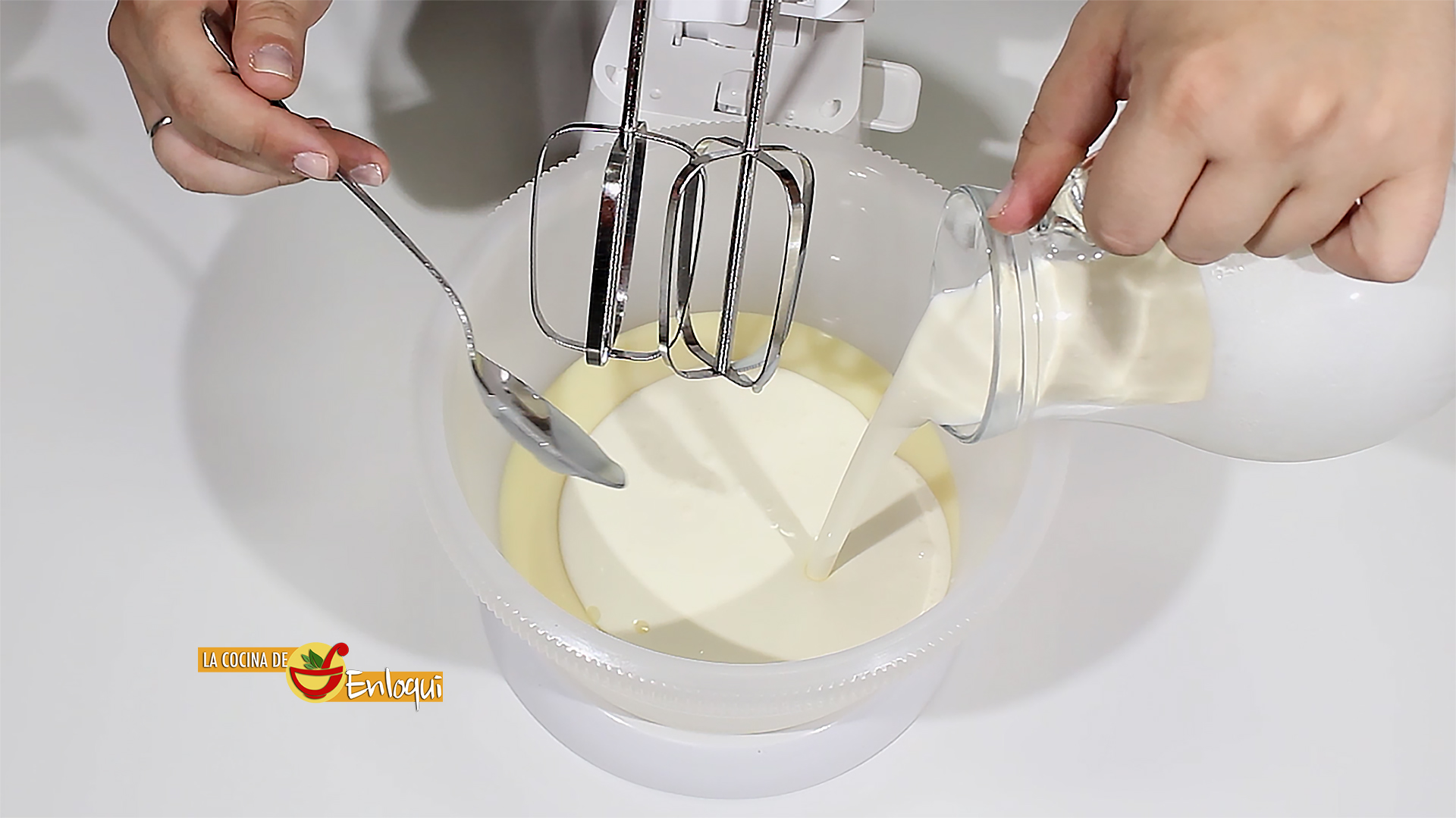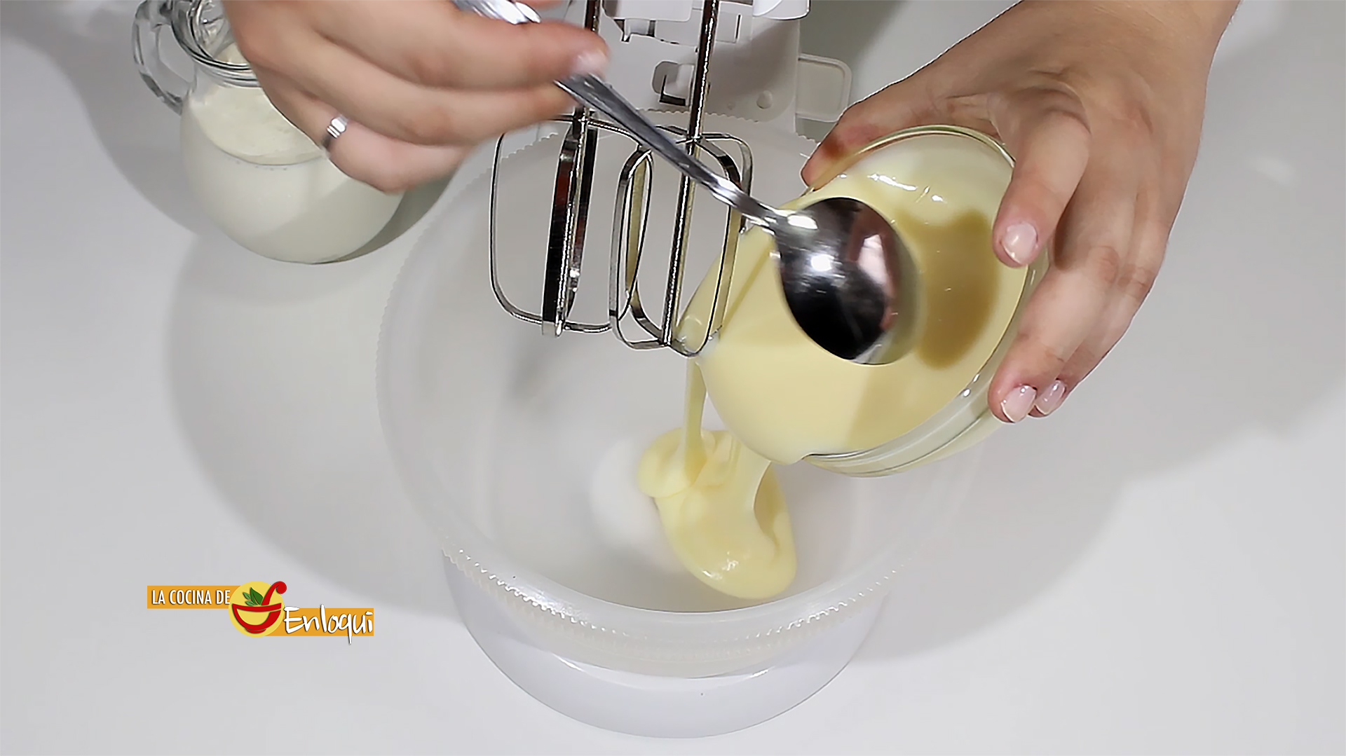 Preparar este postre es bastante sencillo, para ello pon en el bol de la batidora leche condensada y la nata.
