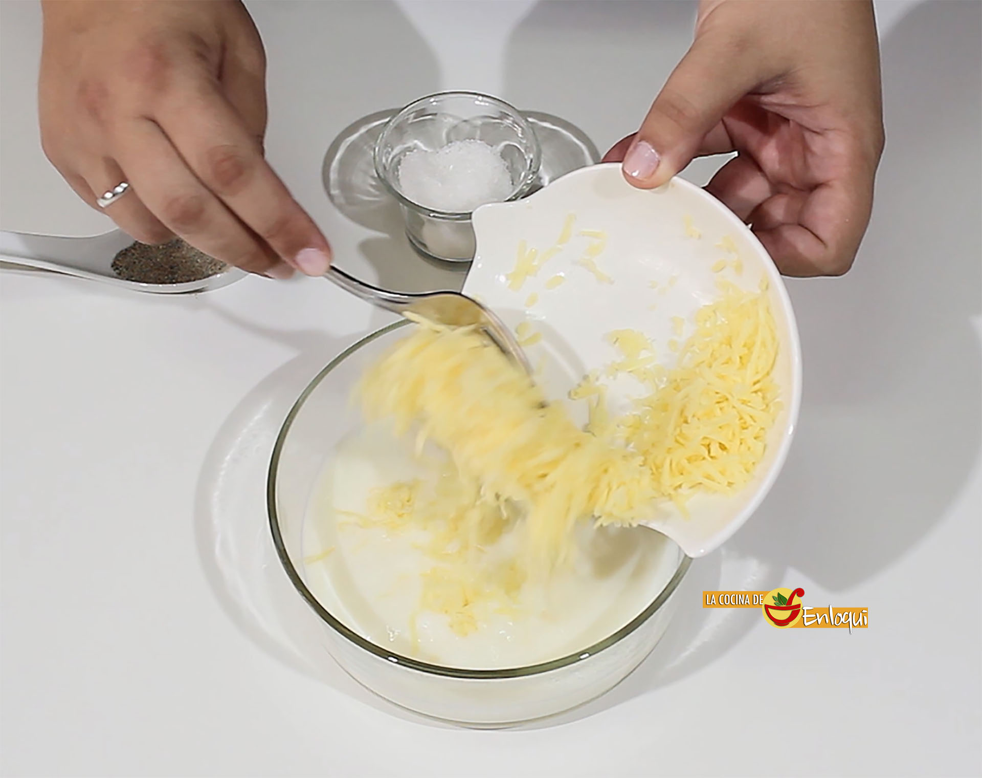 Ahora es el momento de preparar la salsa de queso, el acompañamiento que dará el toque genial a nuestro plato. Para ello calienta bien la leche y vierte sobre ella el queso que hayas elegido después de rallarlo. Salpimenta y mezcla bien. Si lo ves necesario puedes usar la batidora para terminar de integrar el queso. Cuando la salsa haya quedado homogénea reserva. No te preocupes si ves muy líquida la salsa, cuando se enfríe un poco el queso ayudará a que tome cuerpo.