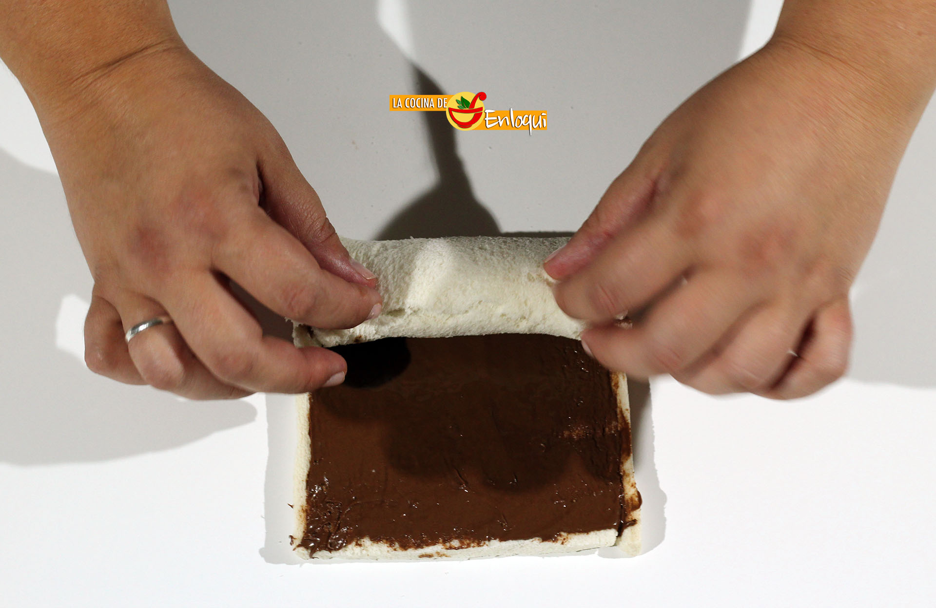 Ahora enrolla sobre sí misma la lámina de pan, quedando la parte con la crema de cacao hacia adentro.
