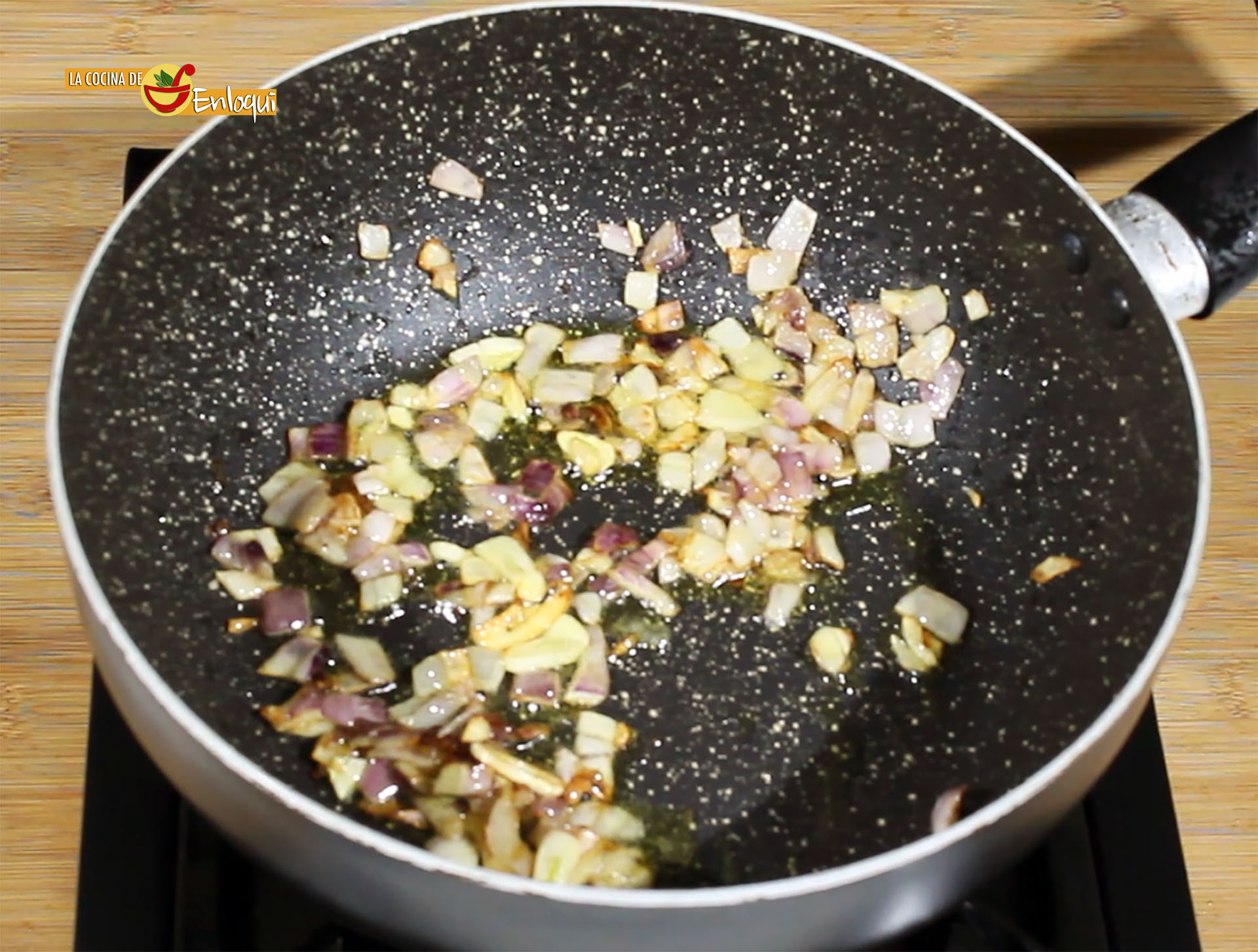 Una vez que estén listos, sácalos y reserva. En la misma sartén pon un poco más de aceite y sofríe la cebolla picada y el ajo laminado. Así tomarán el sabor de los jugos de la carne.