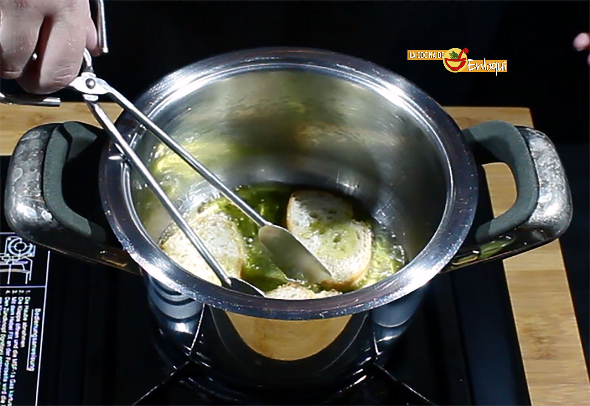 Añade el agua, los ajos y el pan frito. Pon un poco de sal y deja cocer a fuego medio-alto durante 20 minutos.