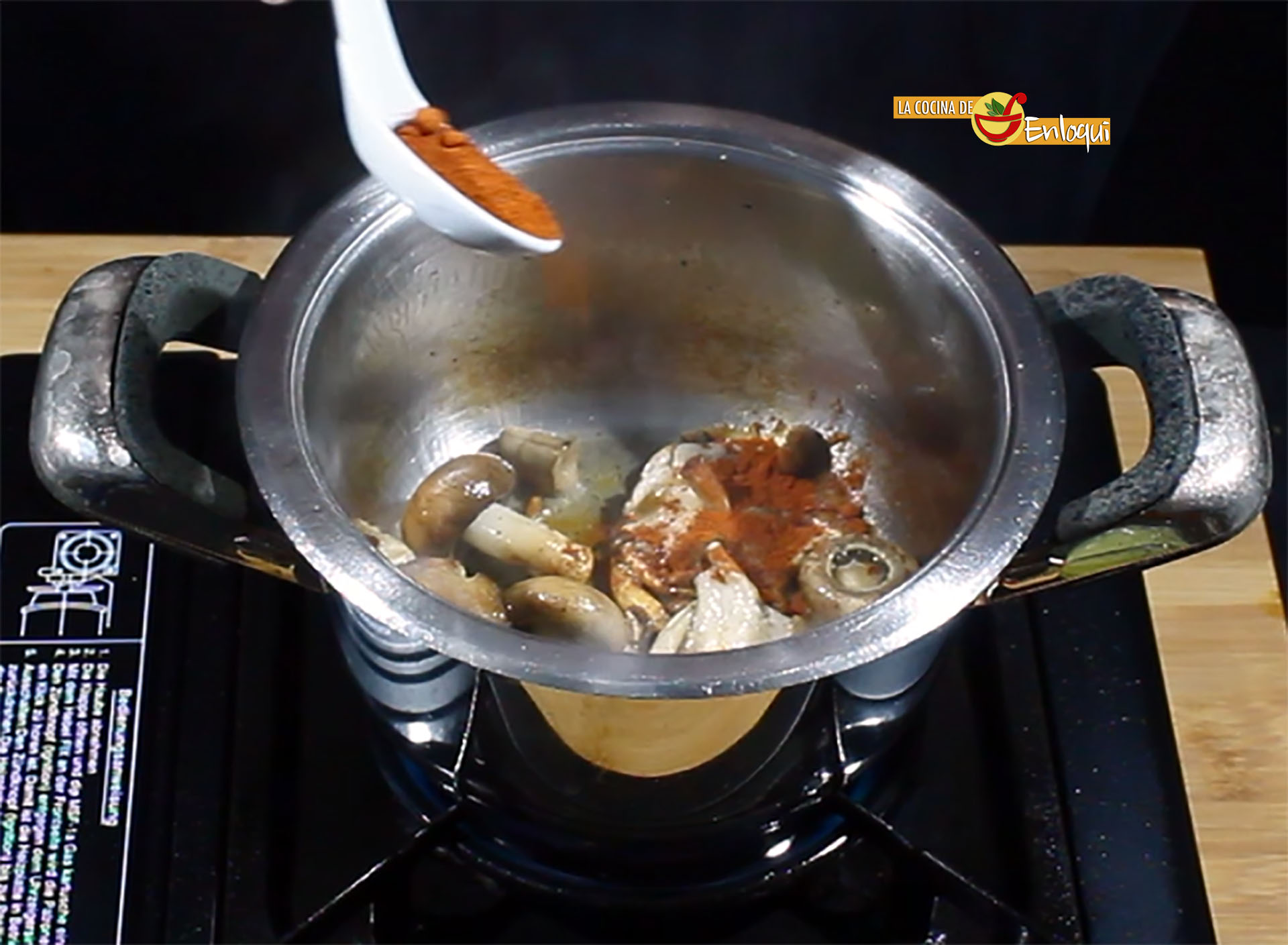 En ese mismo aceite fríe las rebanadas de pan del día anterior. Cuando estén listas reserva. Y por último en el aceite que ha quedado saltea las setas durante unos minutos, poco antes de retirar echa una cucharada de pimentón, déjalo tostar unos segundos, presta atención no se queme.