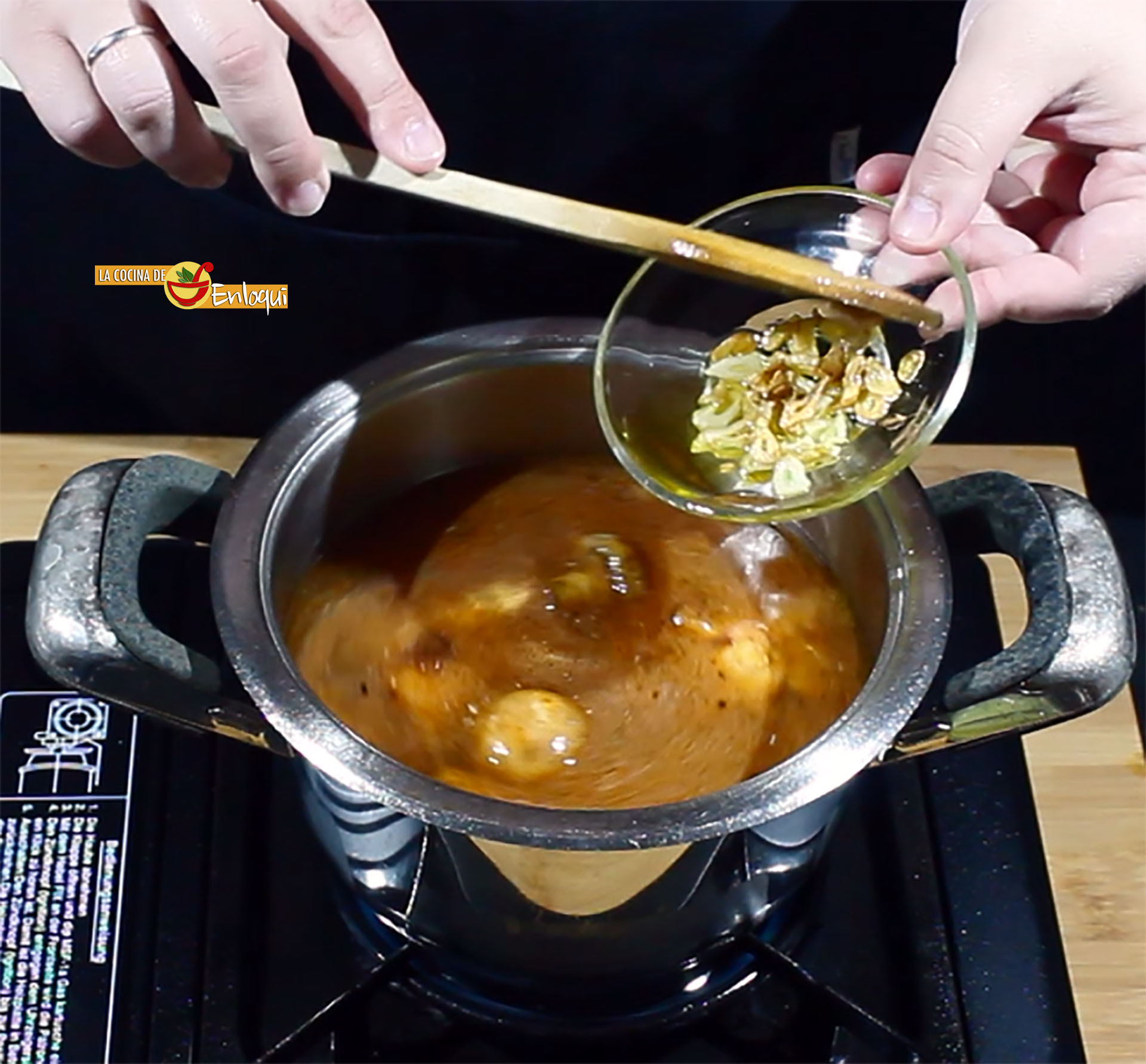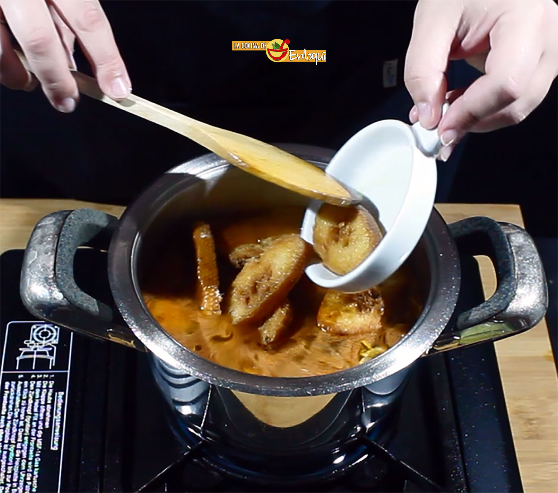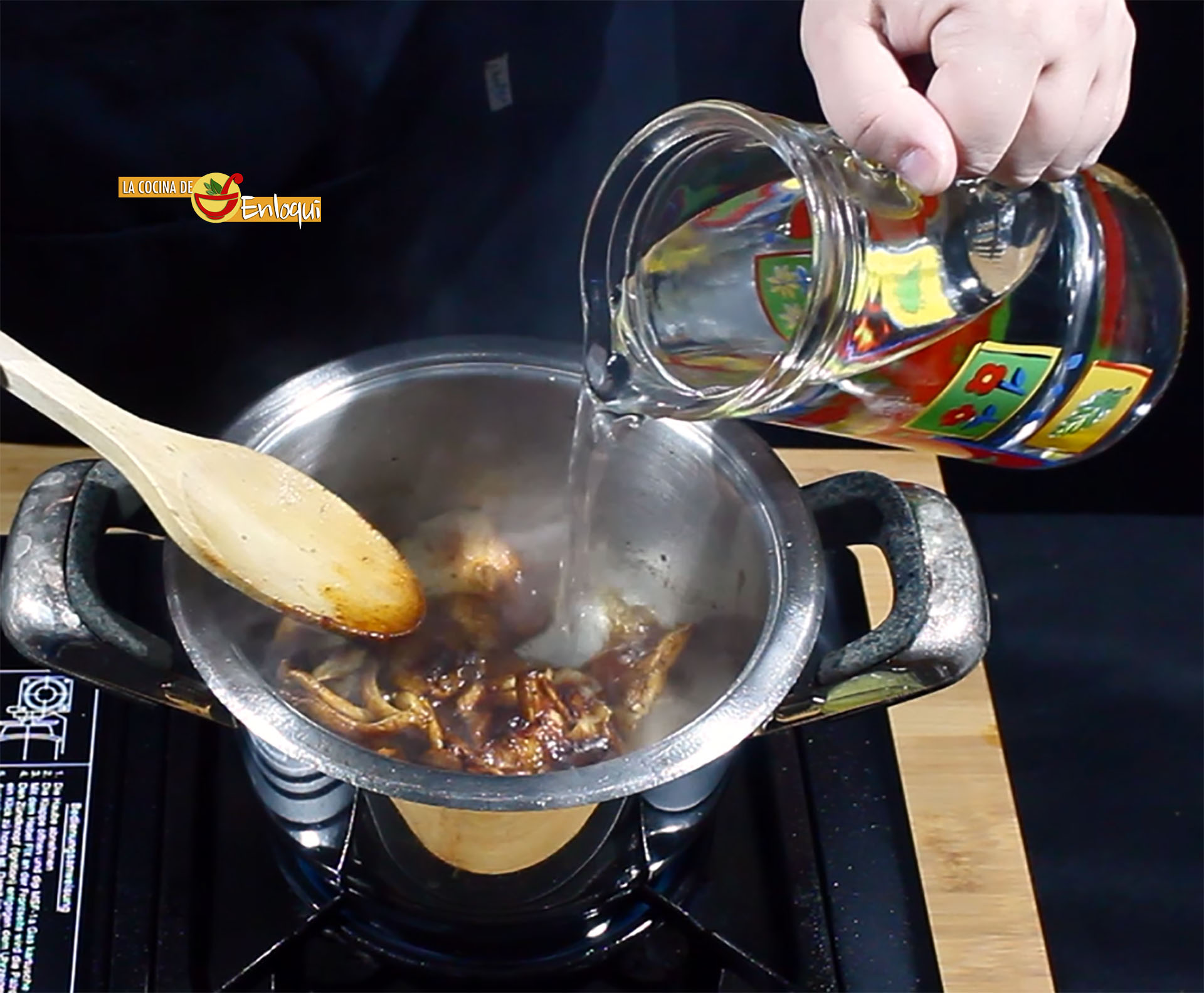 Pon en la olla un fondo de aceite en el que freír los dientes de ajo pelados y laminados. Lo ideal es que los ajos queden doraditos, pero con cuidado para que no se quemen porque el sabor sería amargo y desagradable. Saca y reserva.