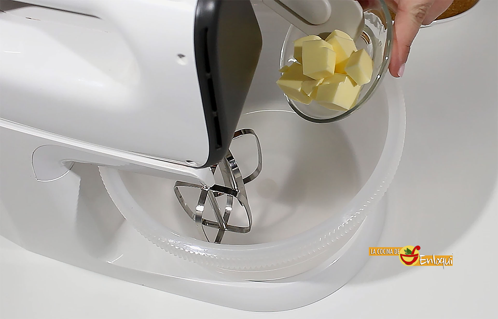 Ya sólo queda preparar lo que será la cobertura de la tarta. Para ello pon en el bol de la batidora la mantequilla y bate junto con el azúcar.