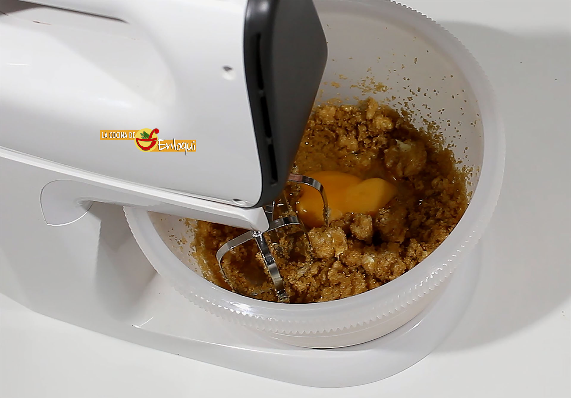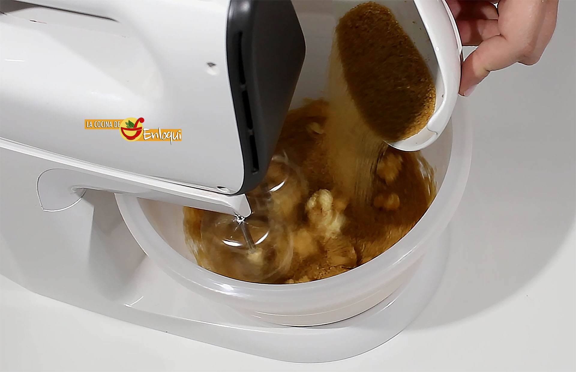 Para preparar esta rica tarta comenzamos elaborando el bizcocho que será la base. Para ello pon en el bol de la batidora la mantequilla a temperatura ambiente y bate junto con el azúcar moreno. Cuando ambos ingredientes estén mezclados añade el huevo y bate rápido.