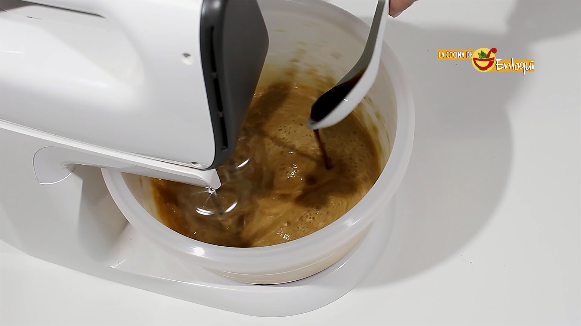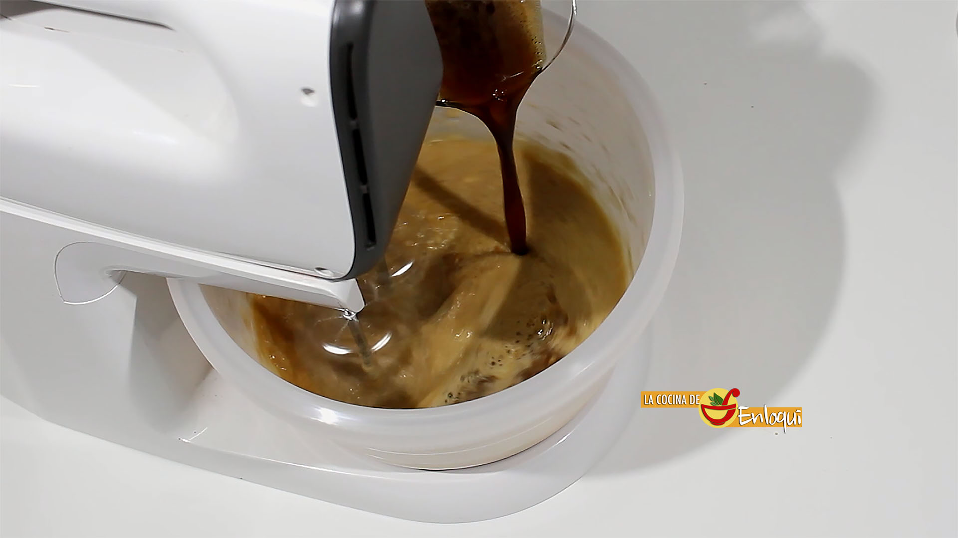 Después incorpora la leche, el café y la esencia de vainilla. Sigue batiendo hasta que quede una mezcla homogénea.