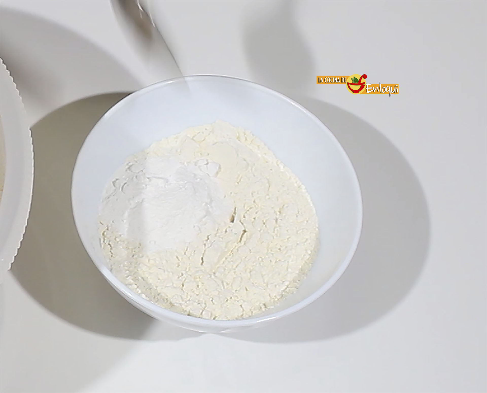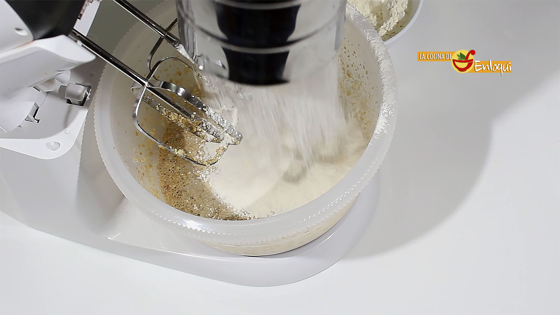 En un recipiente aparte mezcla la harina con la levadura y la sal. Añade a la mezcla anterior poco a poco tamizando hasta conseguir que todos los ingredientes liguen.