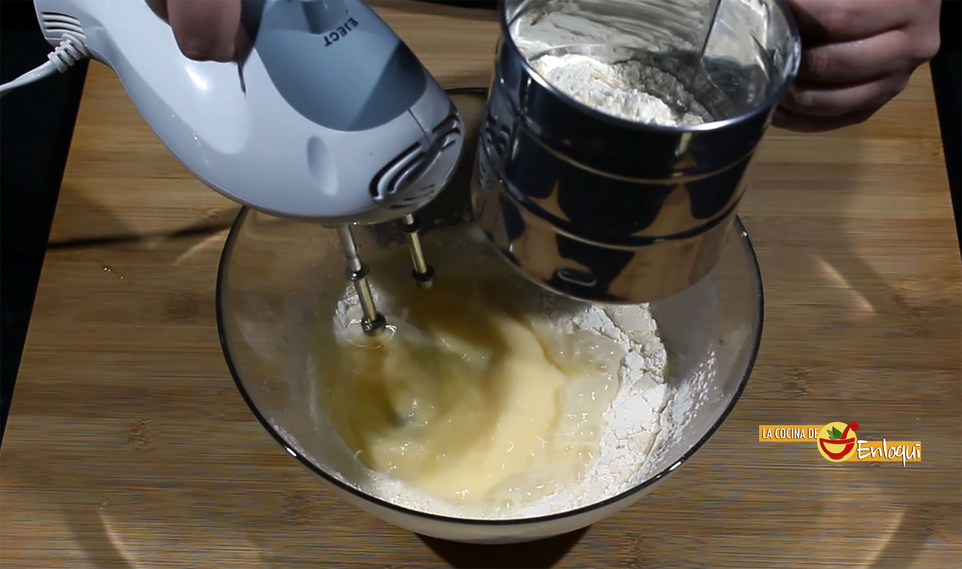 Para comenzar pon en un bol amplio los huevos, el azúcar, el aceite y la leche. Bate con las varillas para que quede todo bien mezclado. A continuación ve añadiendo poco a poco la harina tamizada, sin dejar de batir.