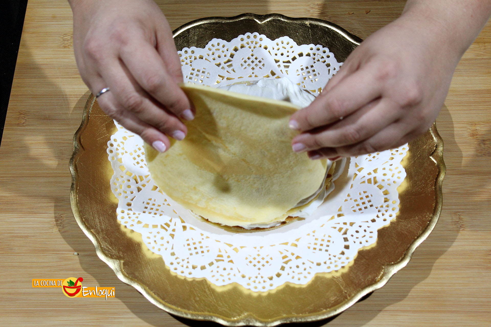 En la bandeja donde vas a presentar la tarta coloca la primera crepe, cubre con una capa de nata montada, extiende bien hasta los bordes y coloca encima otra crepe. Repite este proceso hasta haber colocado todas las crepes con una capa de nata montada entre ellas.