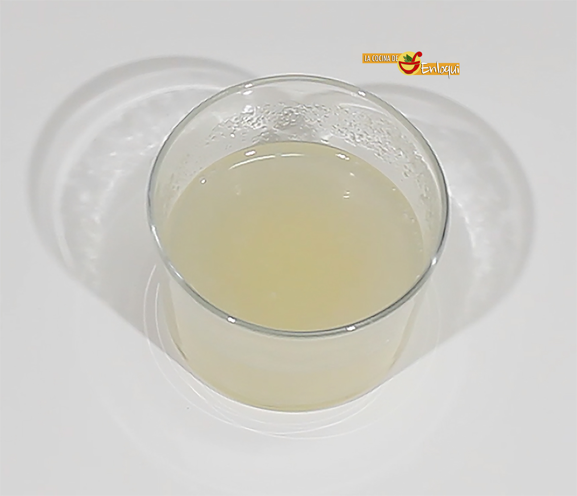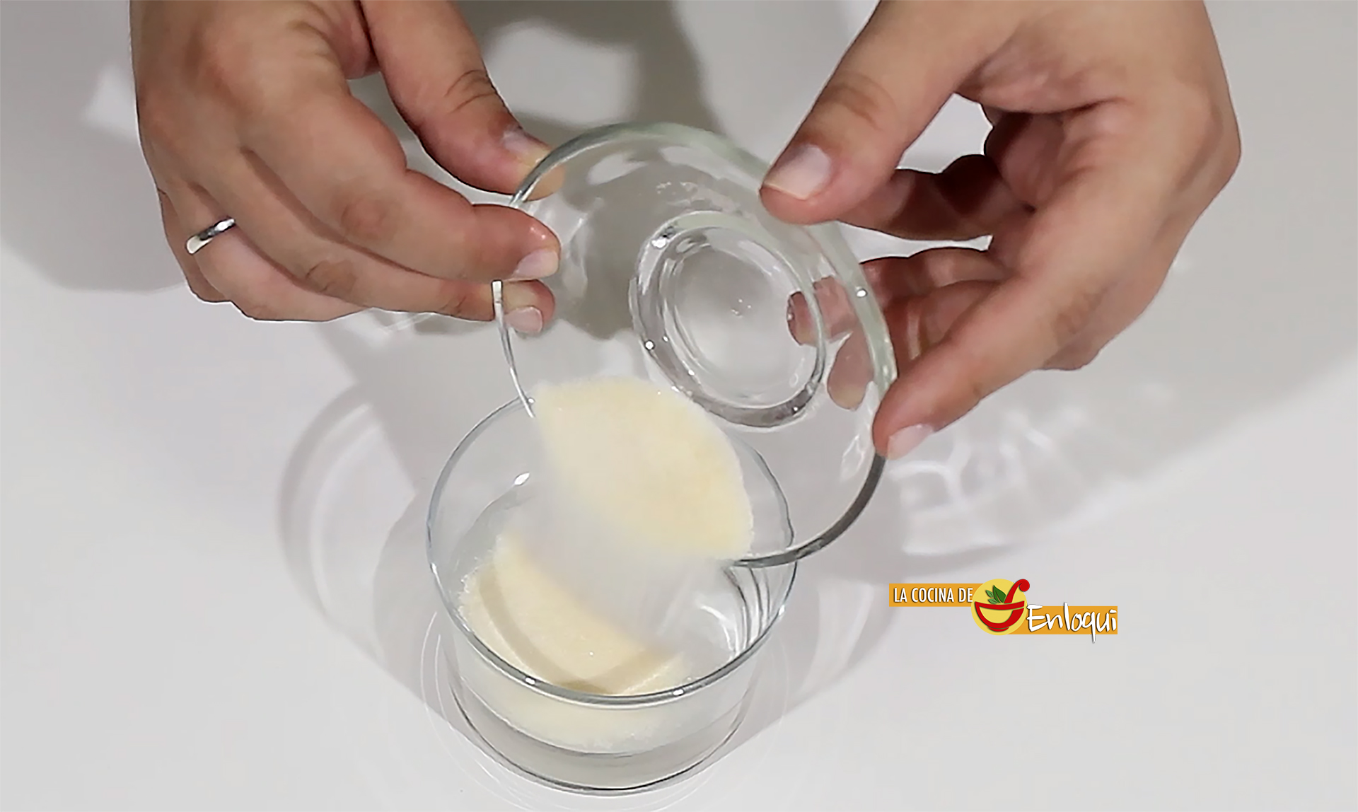 Pasados unos minutos podrás ver que la gelatina se ha hidratado, el polvo de gelatina ha absorbido el agua y ha creado una pasta. Lleva al microondas y calienta a máxima potencia durante 20 segundos. Ahora verás que la mezcla vuelve a tener una textura líquida. Reserva.