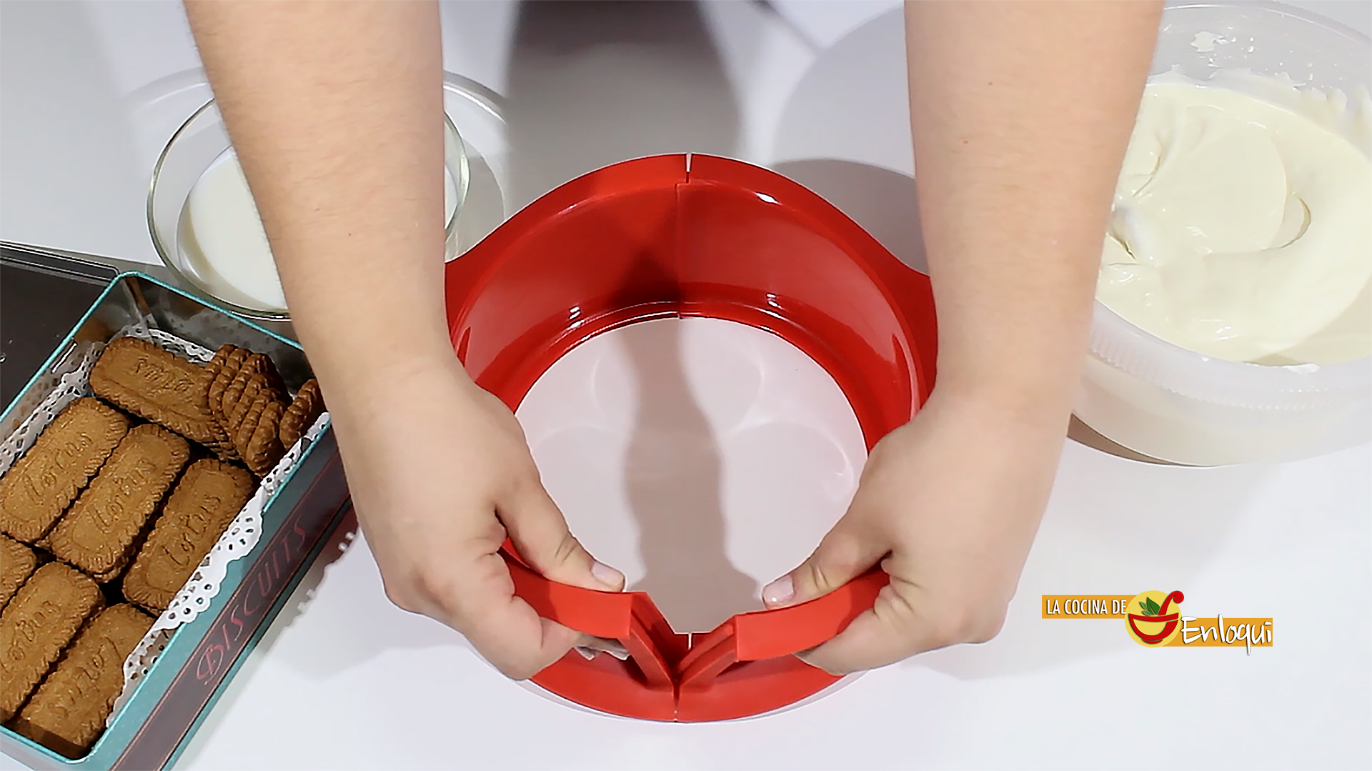 Para montar esta tarta vamos a usar un molde desmontable que será muy práctico para este tipo de elaboraciones. La base es de cerámica, por lo que es el plato en el que después se lleva a la mesa y los laterales son de silicona y se desmontan con bastante facilidad.