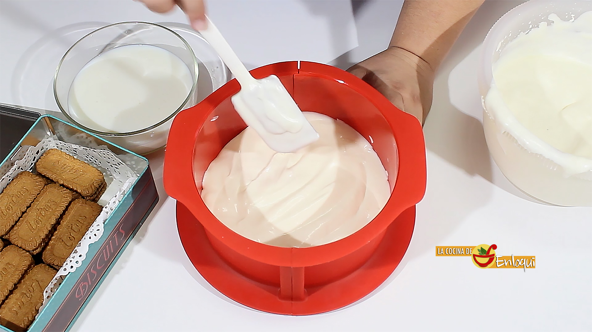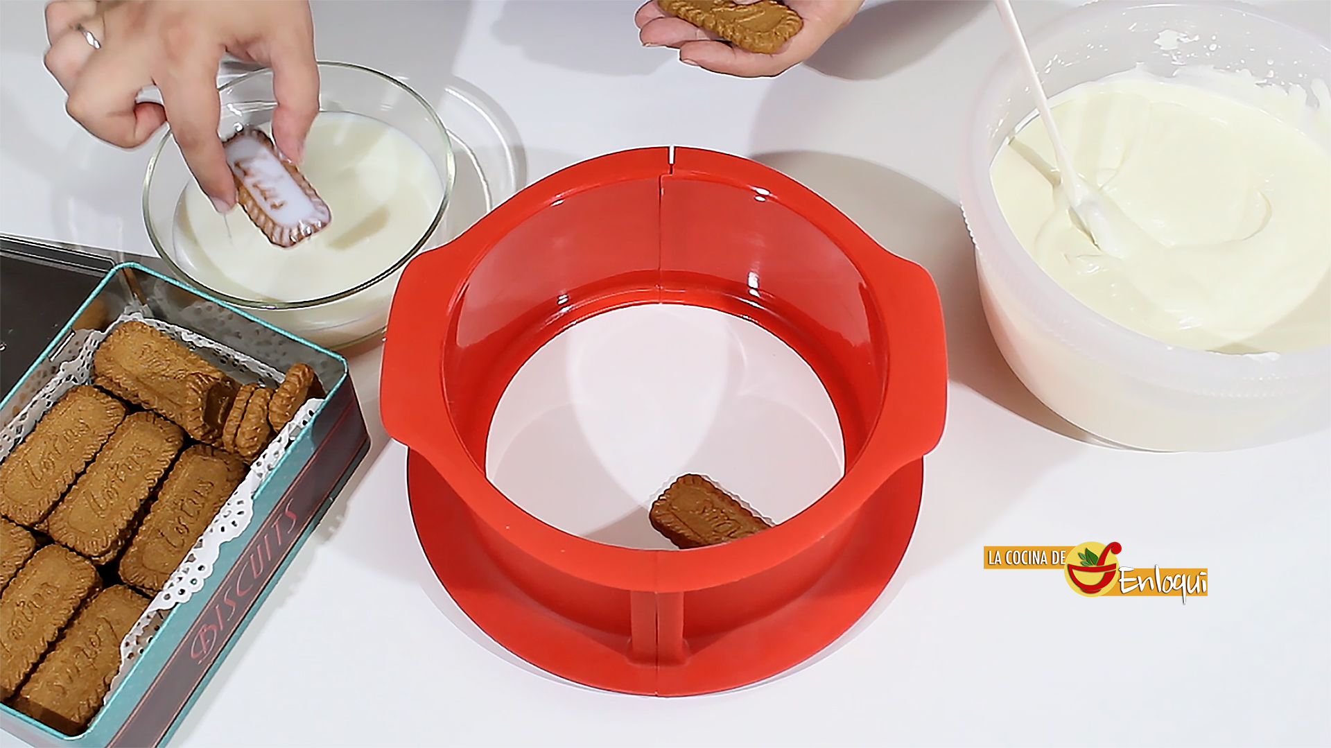 Para montar la tarta en el molde comienza preparando la base. Moja las galletas en la leche y coloca una capa de galletas mojadas en leche por toda la superficie. No es necesario empapar las galletas, con mojar un poco es suficiente. Coloca todas las galletas que puedas en la base, pero no te preocupes si queda algún huequecito, no es una base compacta de galletas prensadas como hemos hecho otras veces.