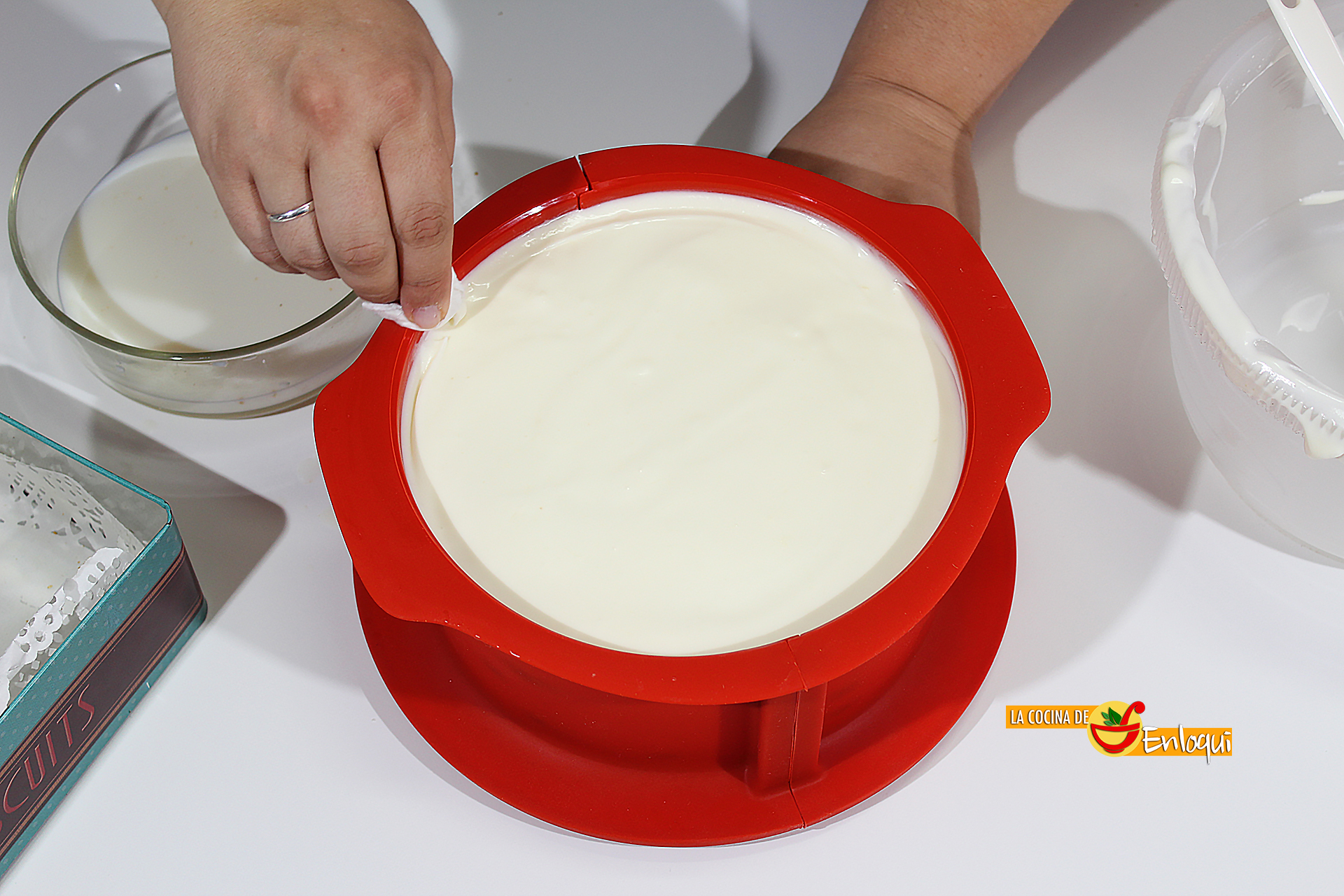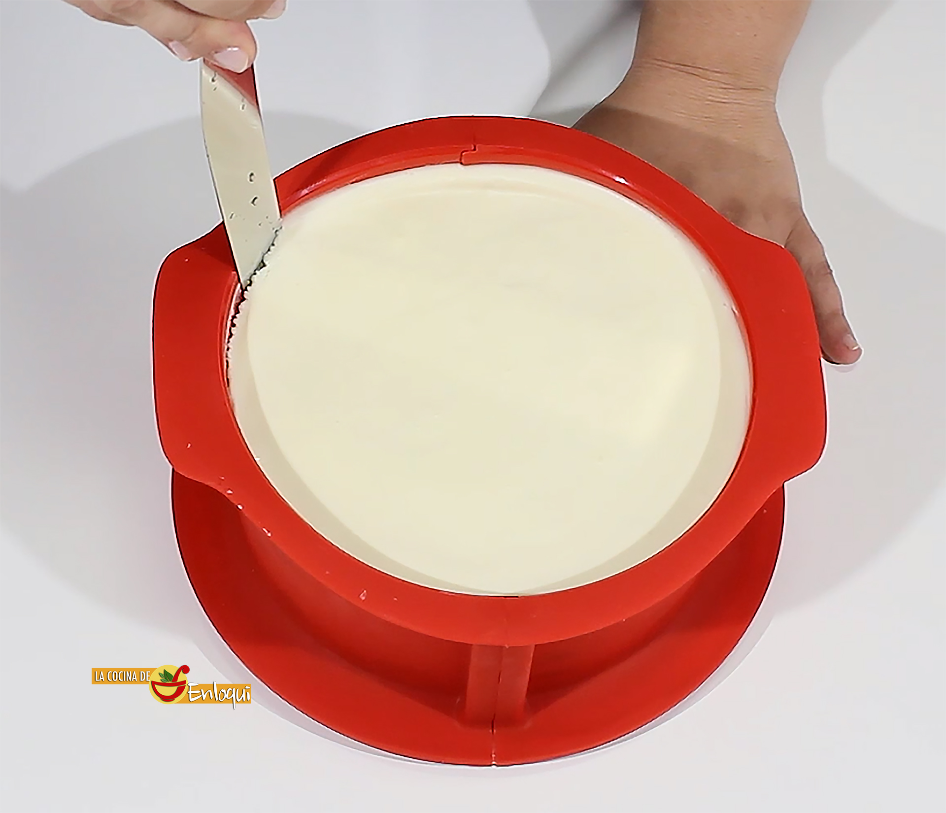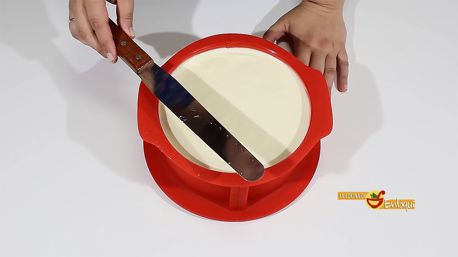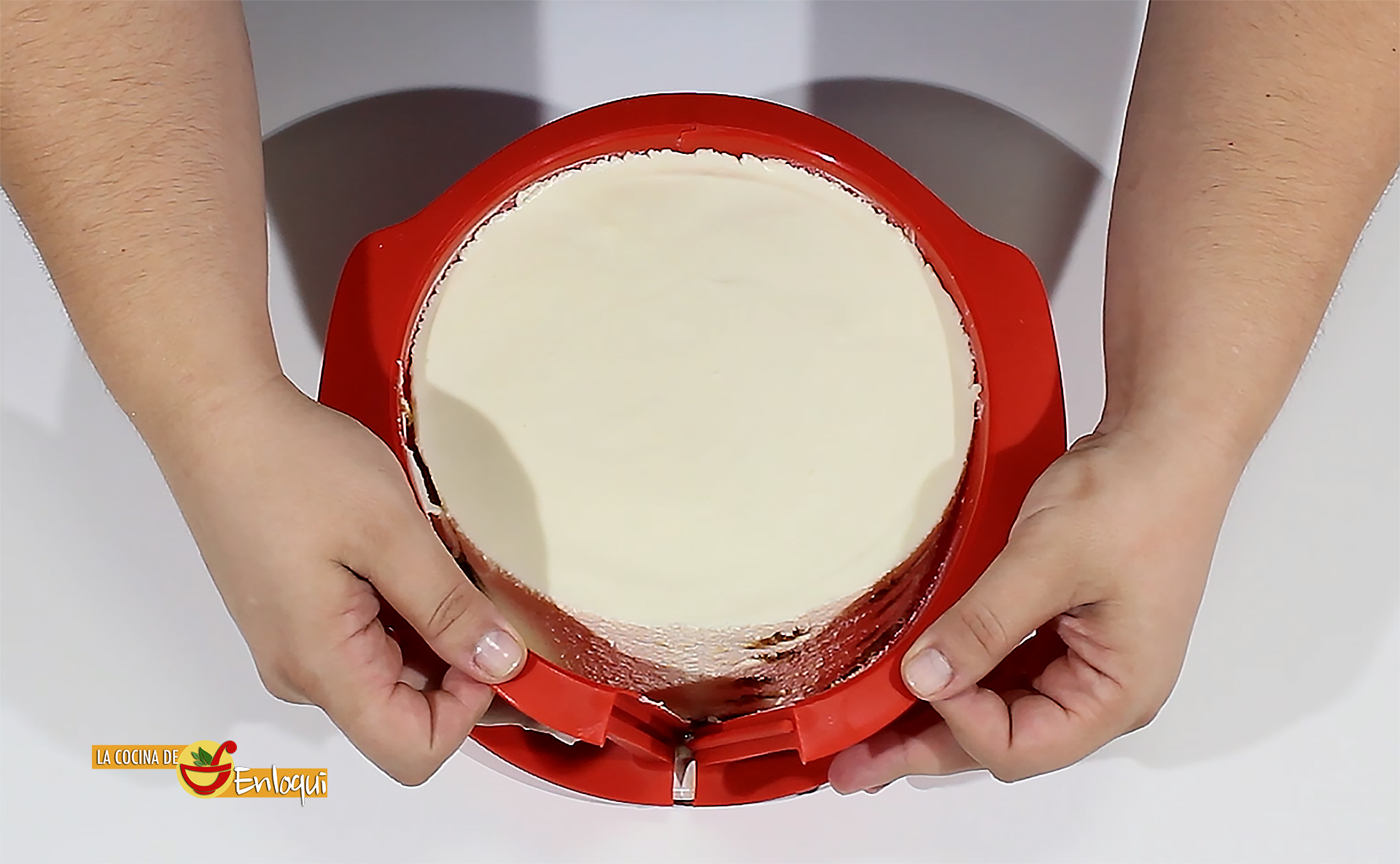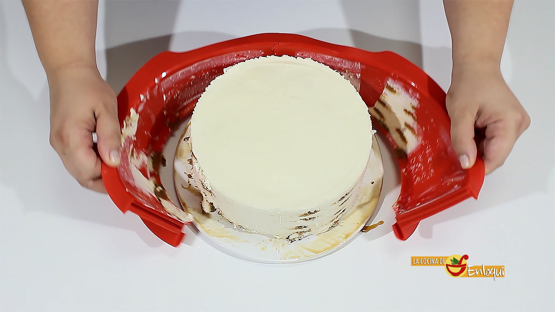 Para desmoldar moja una espátula o un cuchillo mojados e introduce en el lateral del molde. Pasa por todo el borde para despegar la tarta del molde. Es importante que esté mojada la espátula para que se deslice con facilidad y no se pegue a la tarta.