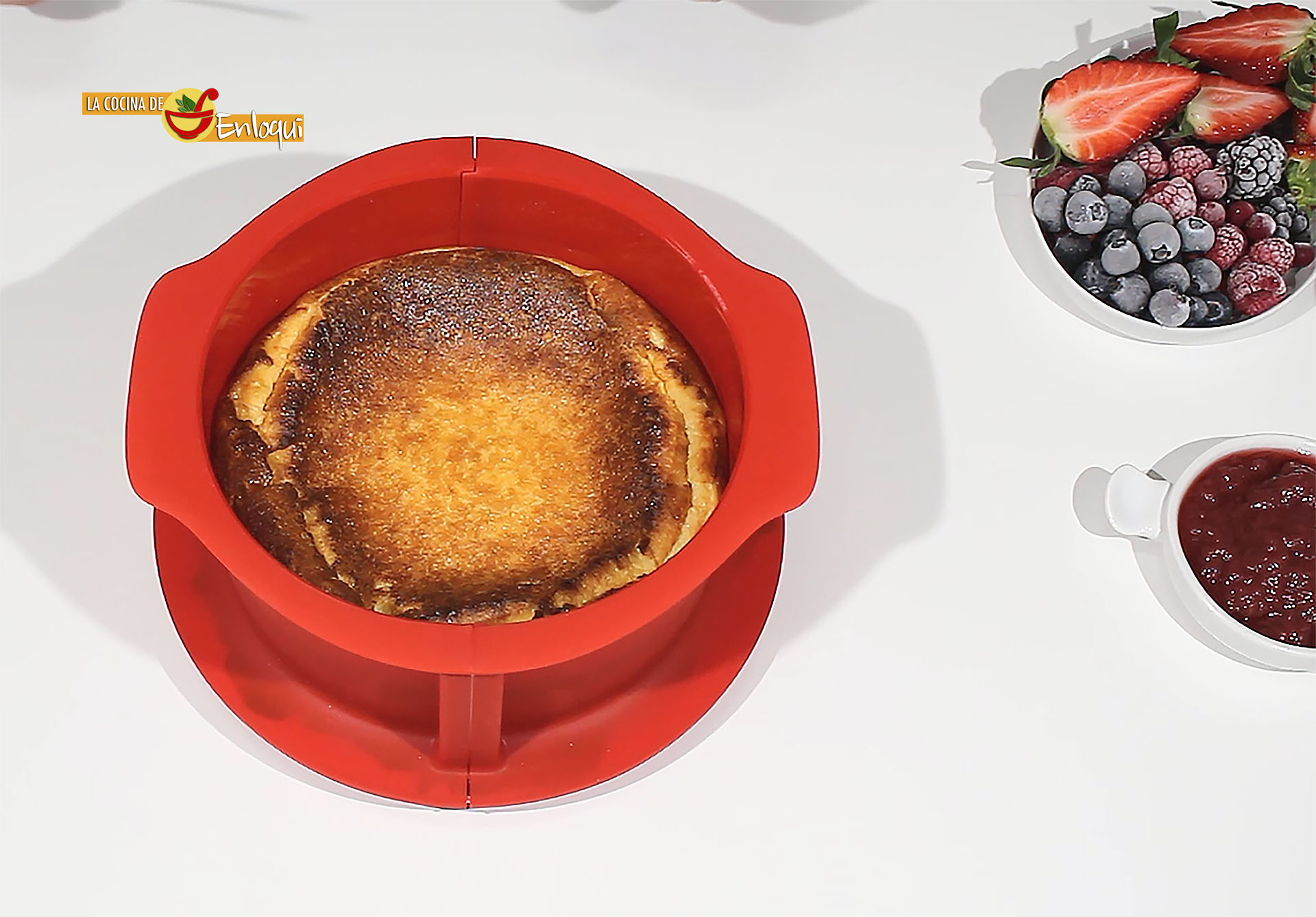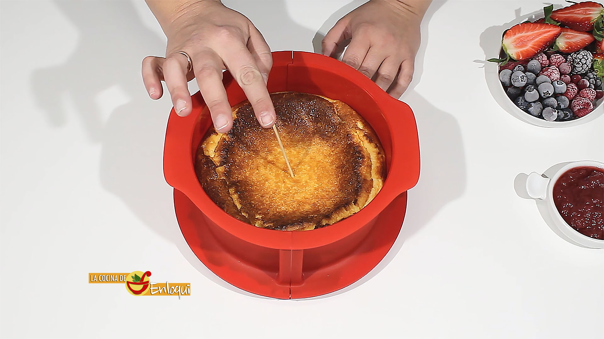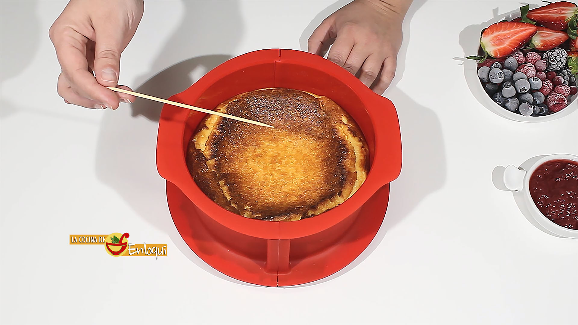 Cuando esté listo saca del horno y deja enfriar a temperatura ambiente.  Desmolda y guarda en la nevera hasta la hora de servir. Es normal si al sacar del horno la tarta presenta una altura y después baja. No te preocupes, no ha salido nada mal, es el proceso normal en este tipo de tartas.