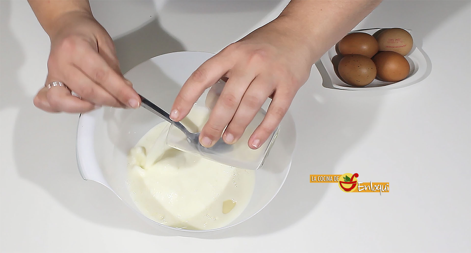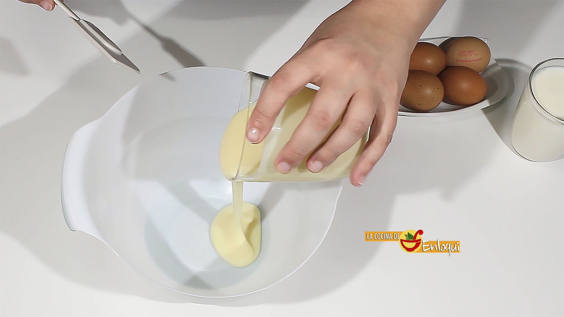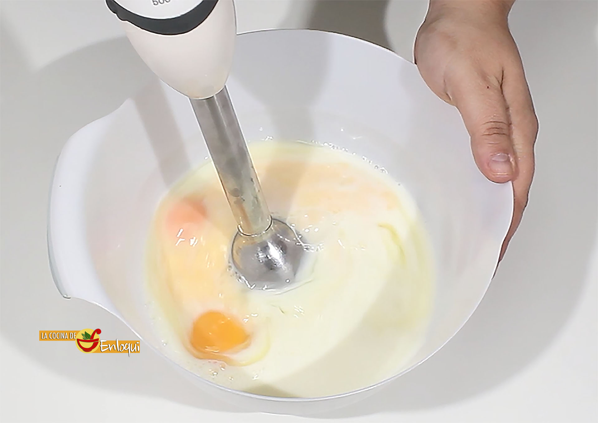 A continuación pon en un bol amplio la leche condensada, la leche (ya mezclada con la maicena) y los huevos. Bate con la batidora eléctrica.