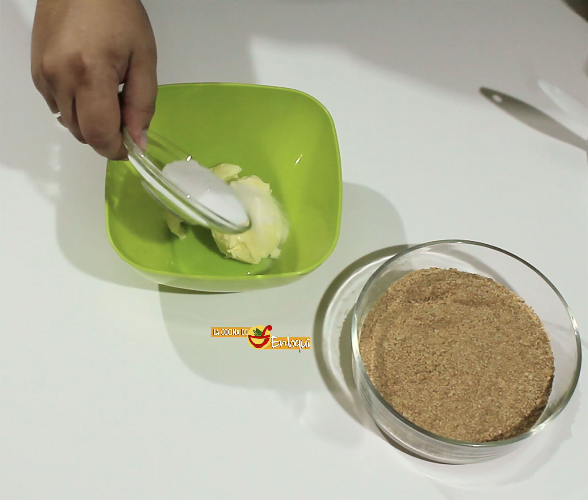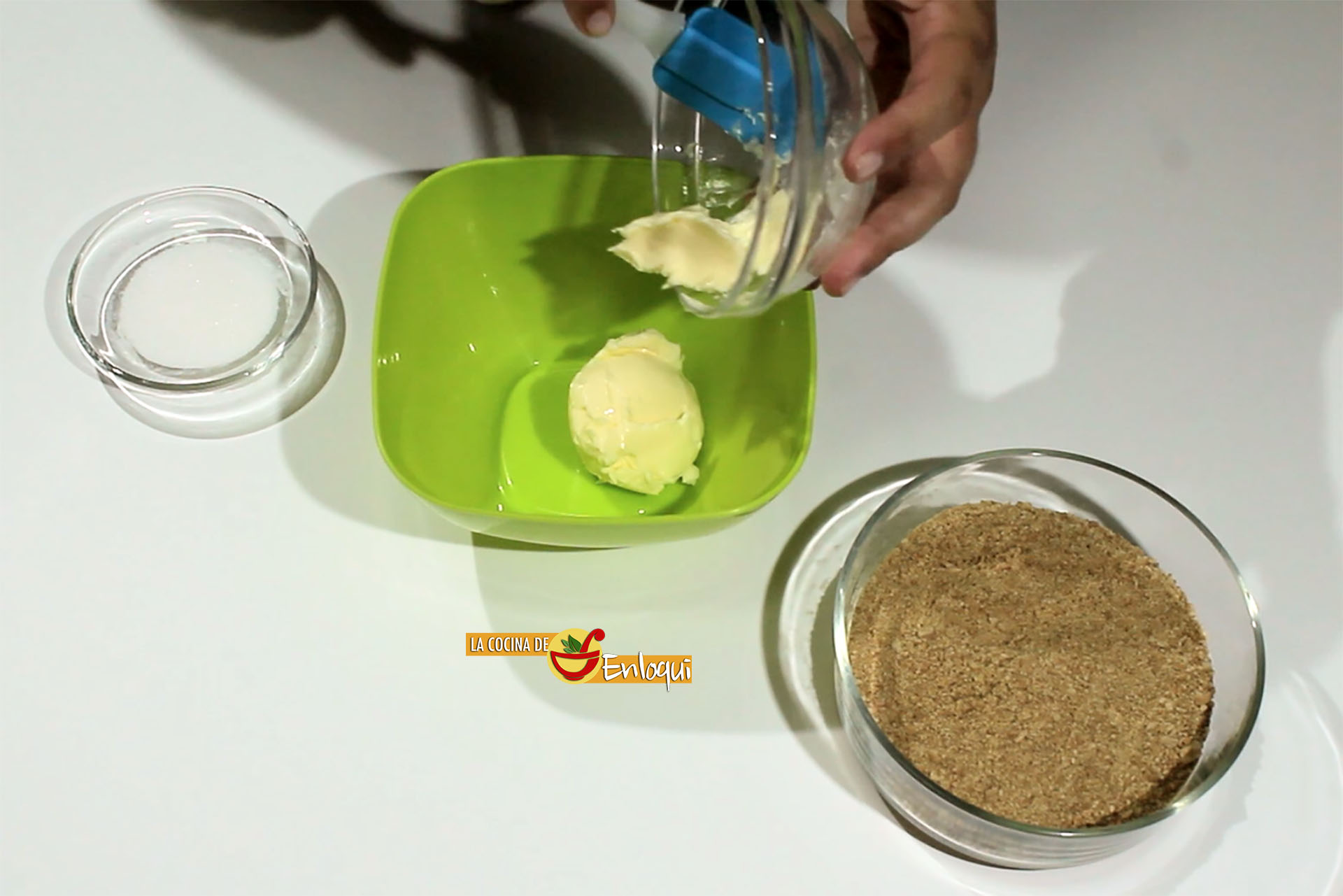 Comienza preparando las galletas, tritúralas con la ayuda de una picadora o bien, en una bolsa tipo zip y aplástalas con un rodillo. El resultado es un polvo fino de galletas. Reserva.