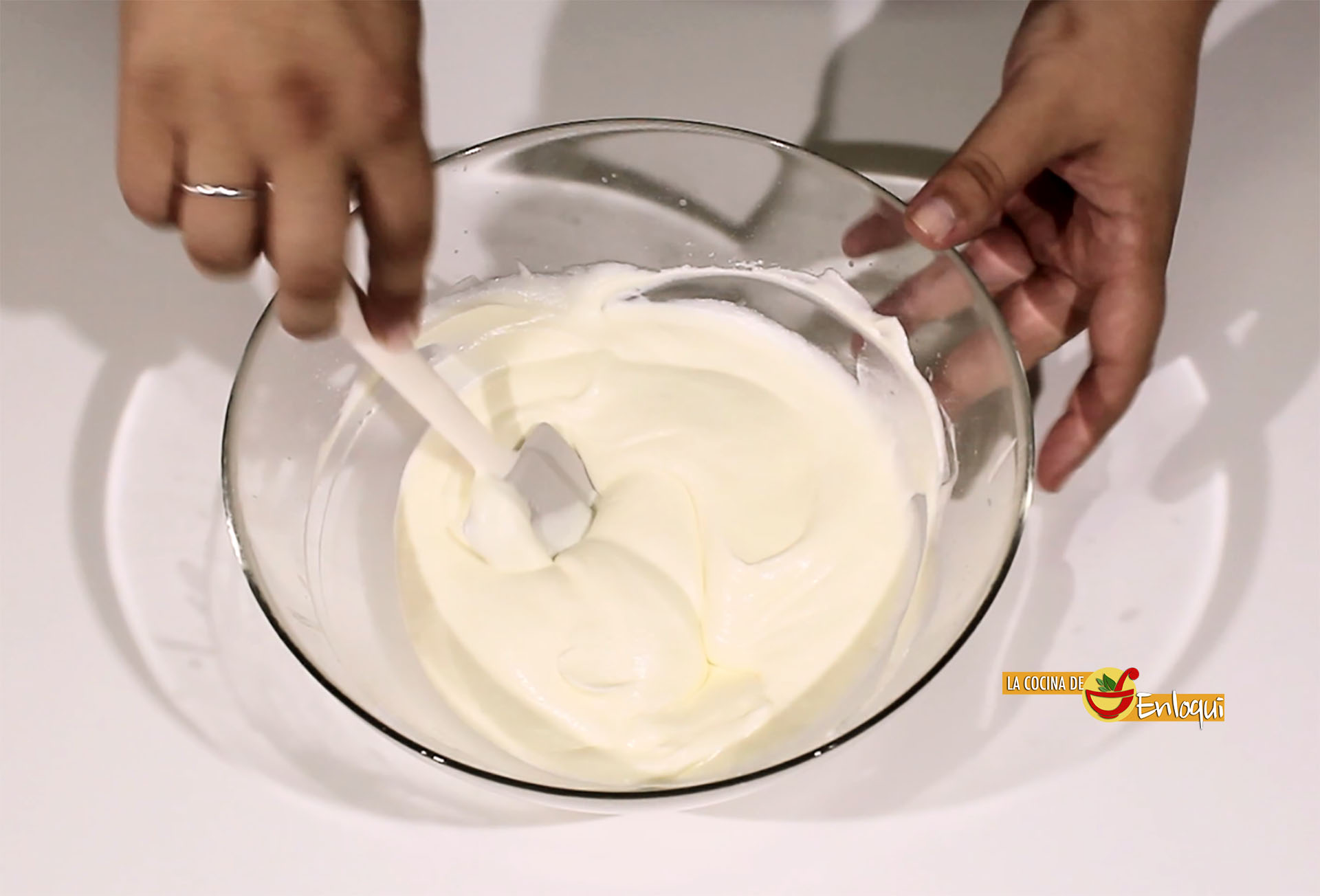 Mientras tanto monta la nata con las varillas eléctricas. La nata debe estar bien fría para que monte mejor. Te va a quedar muy cremosa pero no montada firmemente porque no vas a añadir azúcar, pero es la textura que necesitas para este postre.