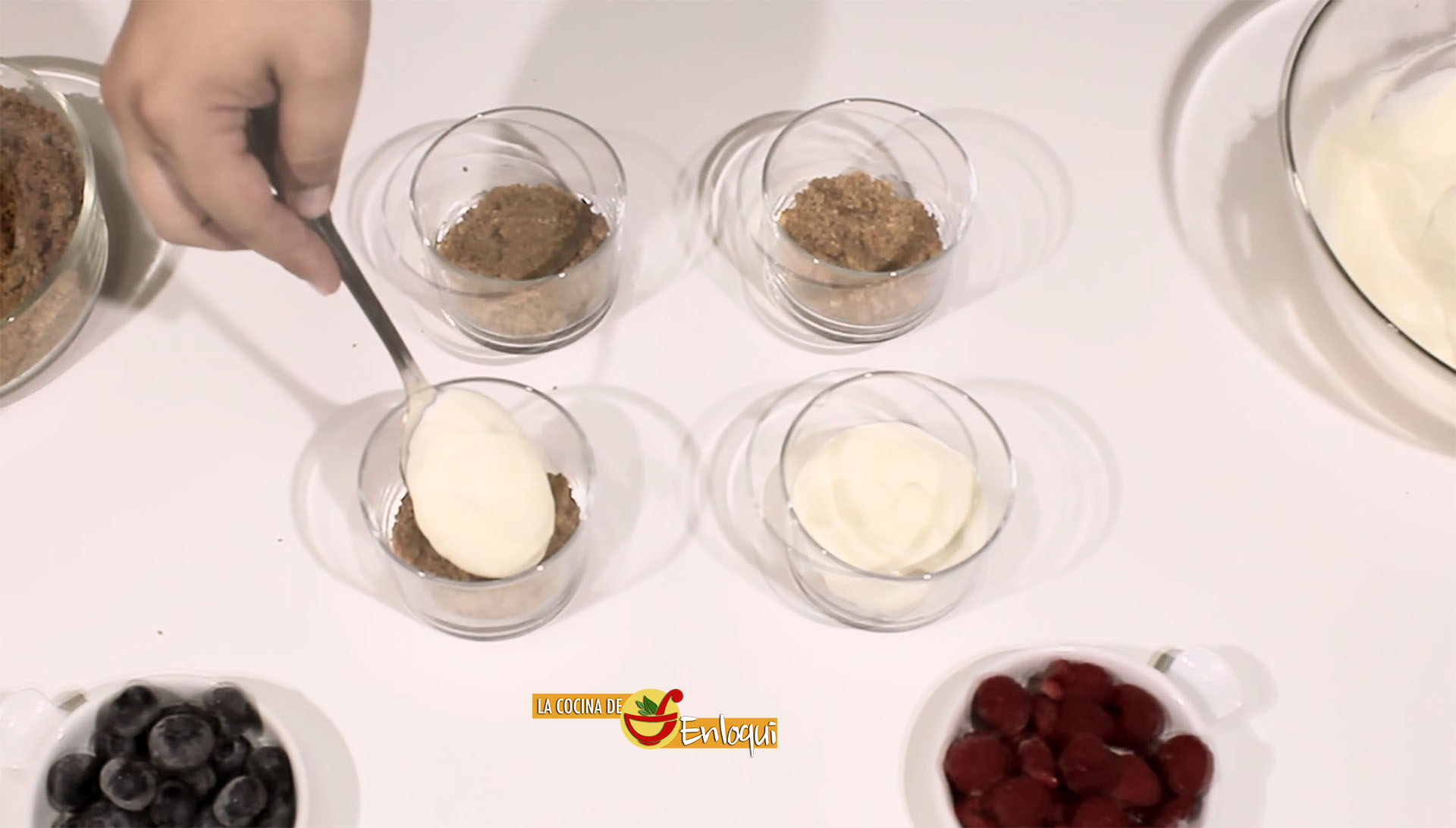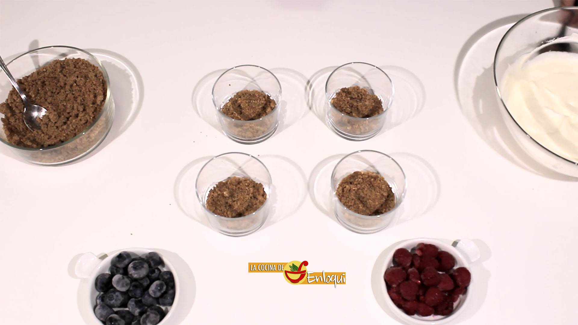 Coloca en el fondo unas cucharaditas de la tierra de galleta que has preparado. A continuación añade una capa de crema y por encima una capa de frutos del bosque. Alterna las frambuesas y los arándanos. Cubre la fruta con otra capa de crema y decora con unos frutos del bosque y unas hojas de menta o hierbabuena.